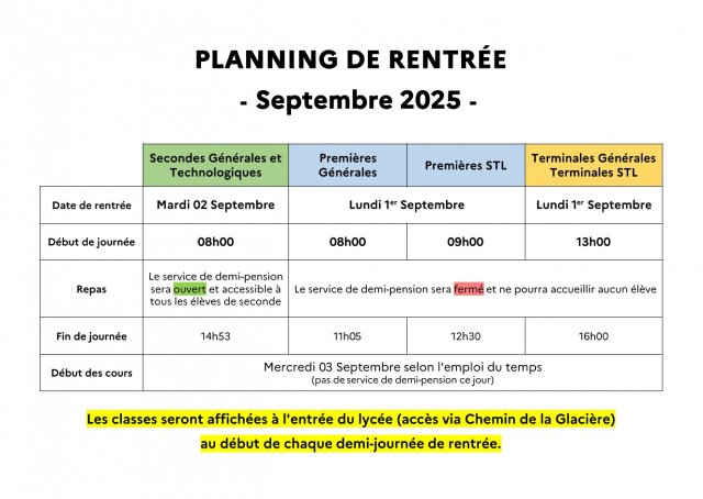 Mardi 2 septembre à 8h30 : rentrée administrative suivie par une journée d’intégration (fin prévue autour de 16h00).
